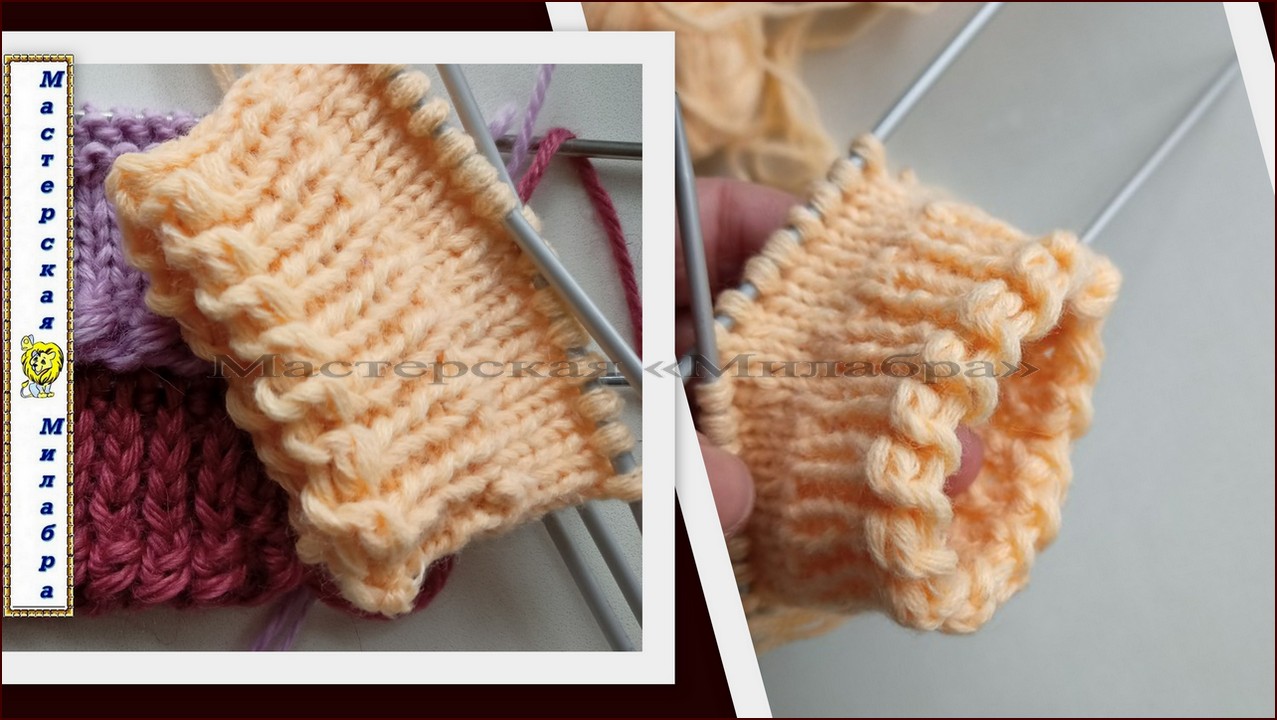 Первая дополнительная петля в расчет не входит (круговое вязание) и провязывается вместе с первой парной петлей. Так же рельеф образуется внутри круглого полотна. Поэтому надо вывернуть первые ряды на внешнюю сторону и продолжить вязание в другую сторону.